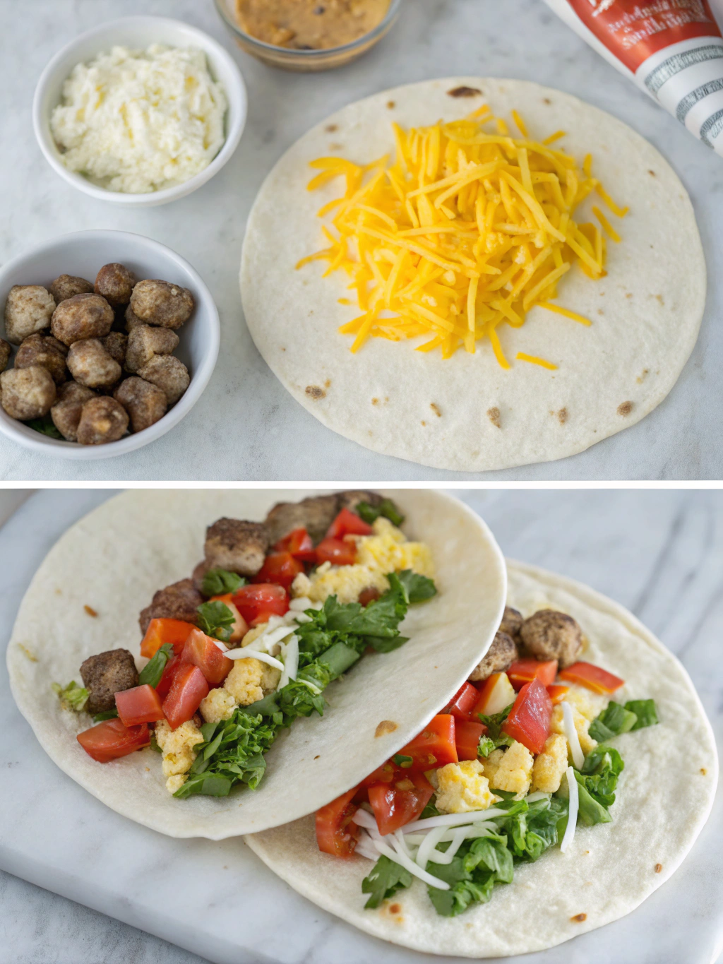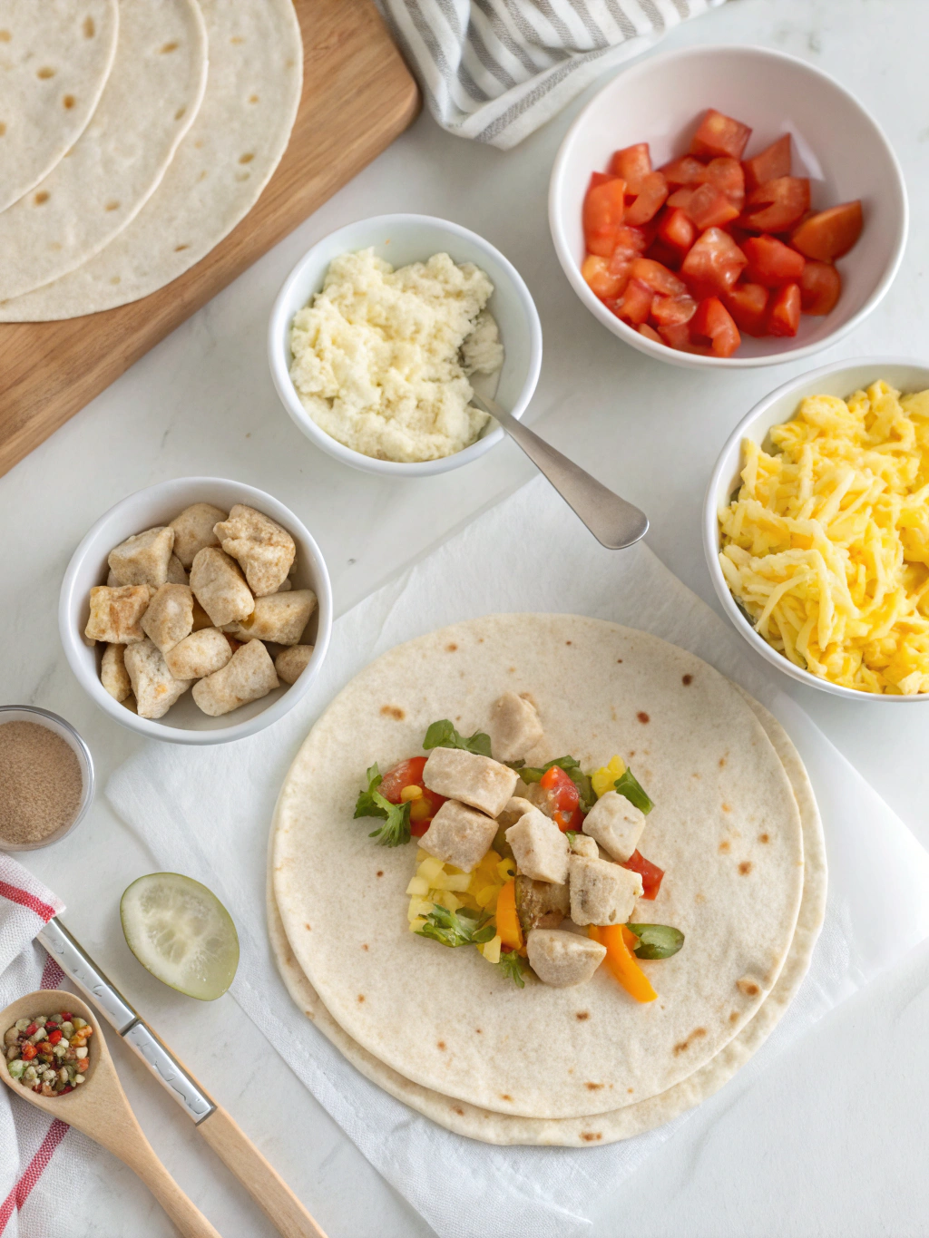 - Lower-calorie: use egg whites, skip cheese or use 50% less, choose low-carb tortillas.